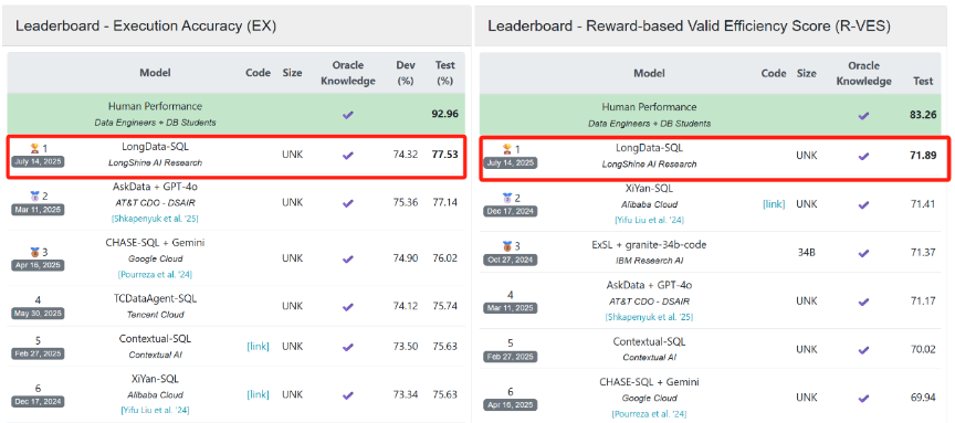 作为业界公认的全球最具权威性最严苛的自然语言转SQL评测基准,BIRD-Bench的挑战性在于要求AI系统不仅能精准理解人类复杂的业务查询意图,更要能在真实的、大规模、结构复杂的生产级数据库中,稳定、高效地生成并执行正确的SQL查询,是检验AI“真功夫”的试金石。