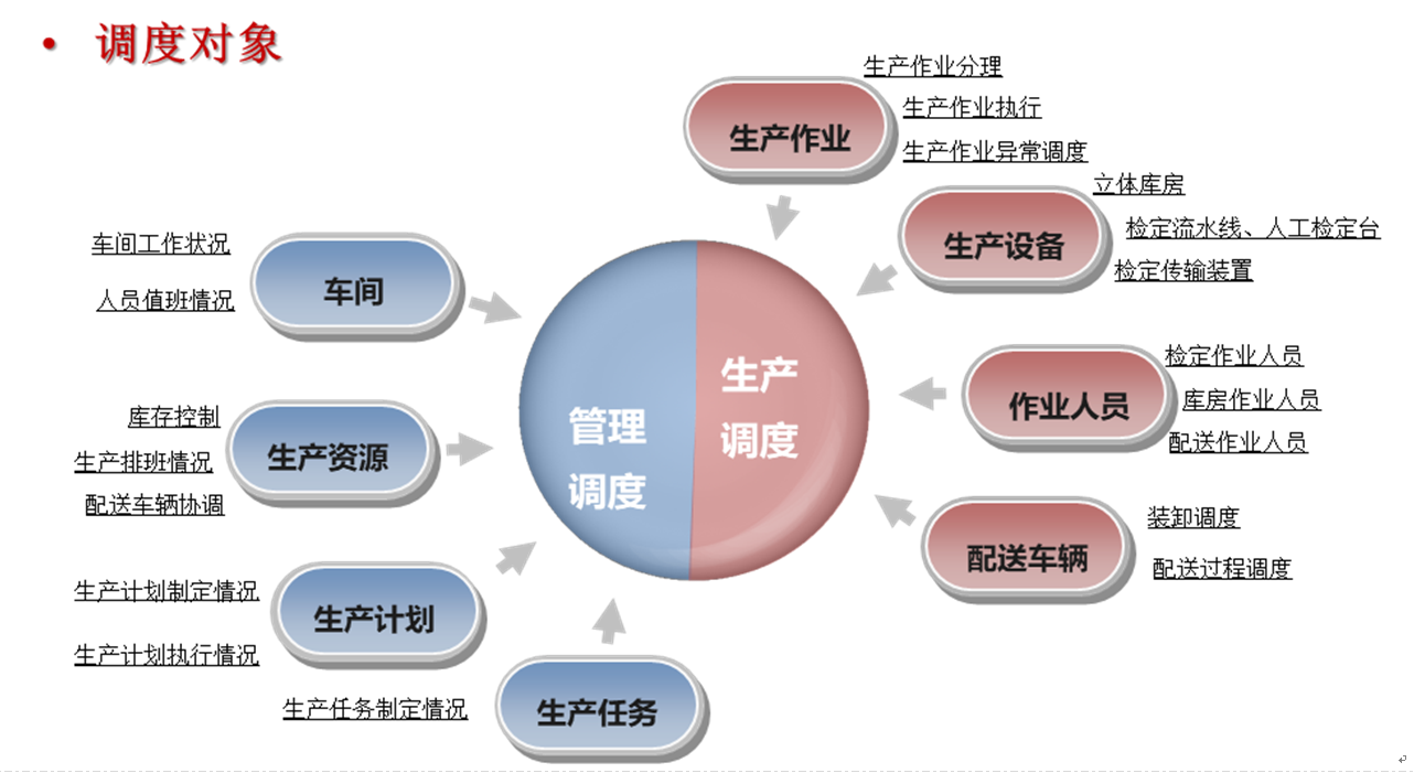 该产品以集约化、精益化、自动化、专业化为核心驱动,建立检定、仓储多线程作业分析引擎、统一作业调度控制台和生产过程监控台,支持智能仓储管理,生产调度管理、生产监控管理、生产分析管理、配送管理,适应了库房、检定台体的人工和自动混合模式,整合并优化批量生产模式的业务流程,集成应用了RFID射频识别、组态监控、视频监控、电子看板、GIS地图等先进技术,系统有效协调智能仓库、自动传输线、自动检定台,形成井然有序的柔性管理生产线,协助专业管理达到可视、可知、可控水平