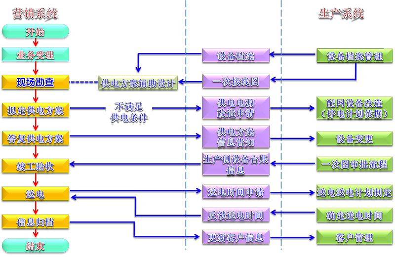 基于营配调贯通成果,优化电力公司营配调抢修、办电、停(送)电、数据运维等业务的协同运作,实现工单统一受理和故障综合研判指挥,强化低压表计故障、欠费停复电的一体化抢修;在线共享电网可开放容量,加快供电方案的编制及答复,同步勘查业扩接入和带电作业方案,优化送电环节;综合平衡安排停电计划,开展计划(故障)停电到户分析、流程化报送及客户的主动通知,进一步提高专业协同效率。